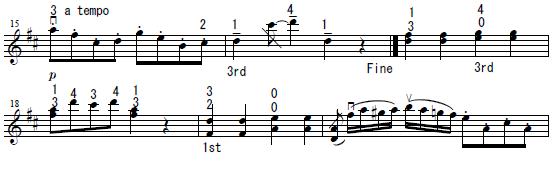 18小節目と19小節目の重音は、押さえる指の位置関係をうまく利用しましょう。