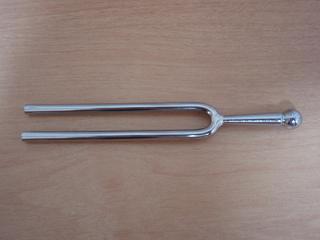 音叉とは、こんなものです。高価なものではないです。二股に分かれた先端を叩くよりも、二股部分の中間くらいを叩くと、軽く叩くだけで音叉が振動しはじめます。